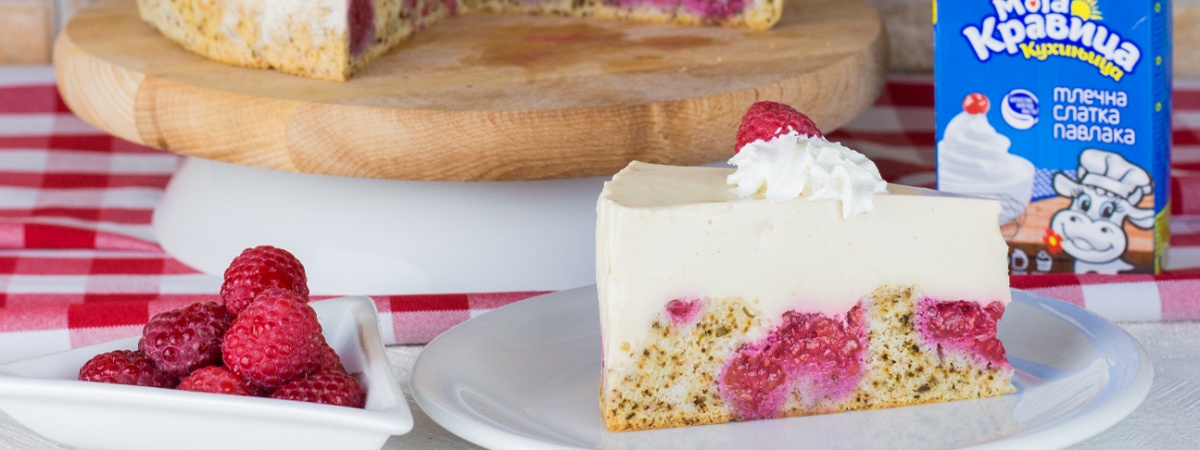 Kolač se seče nakon nekoliko sati – kada se dobro ohladi, a želatin potpuno stegne. Servira se sa ulupanom slatkom pavlakom i malinama.